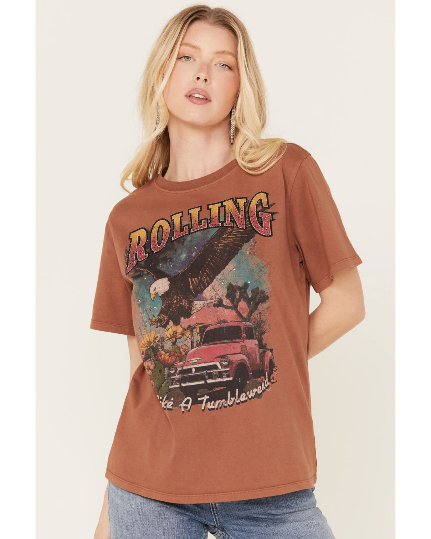 - Rhinestone “Rolling Like a Tumbleweed” with truck and eagle scenic graphic on front