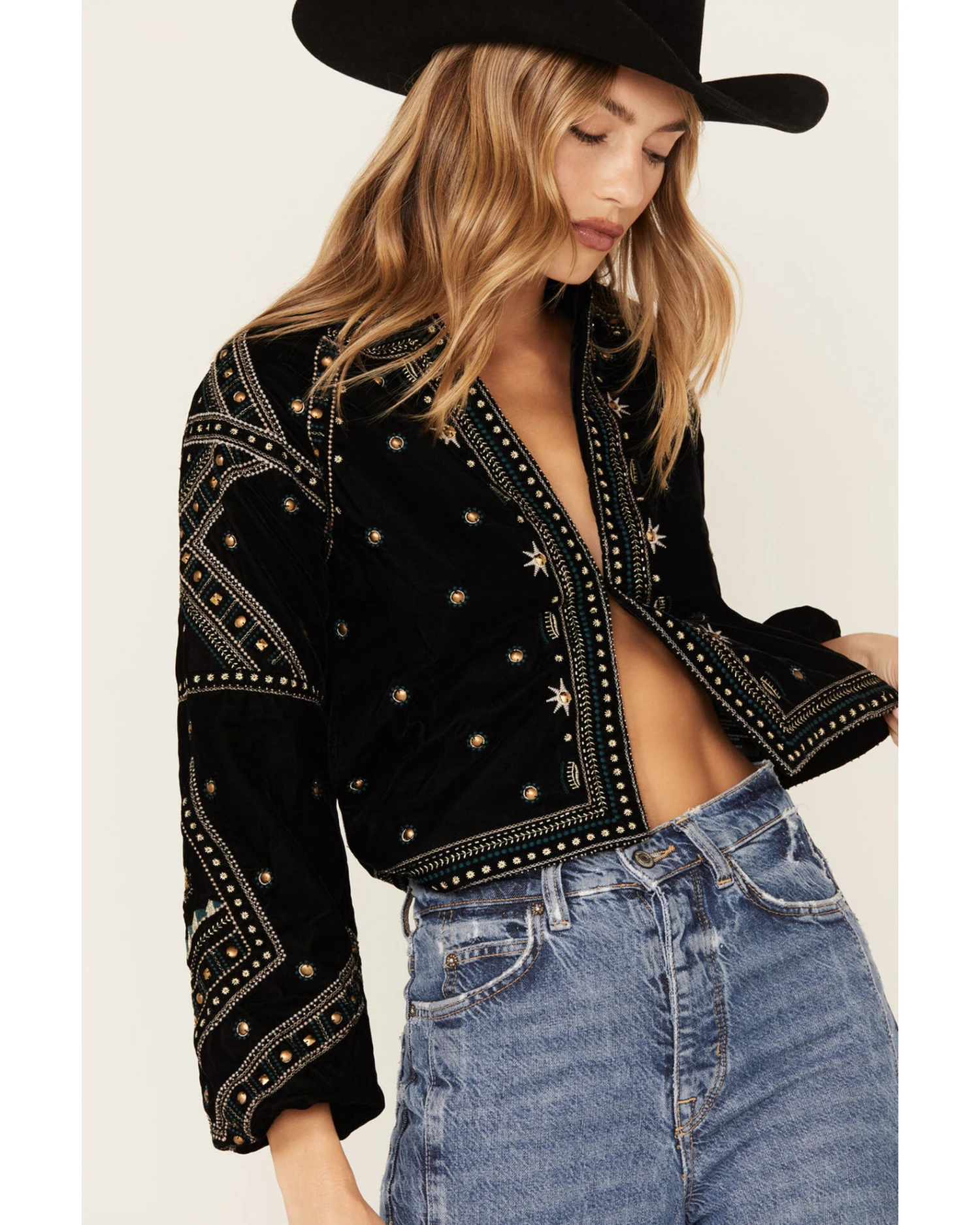 - Black with allover embroidery and gold studded accents